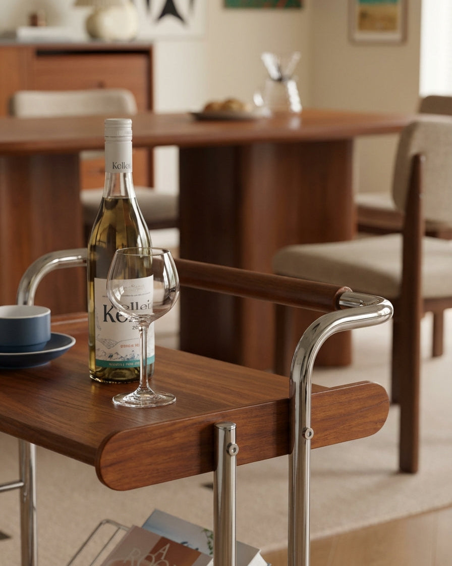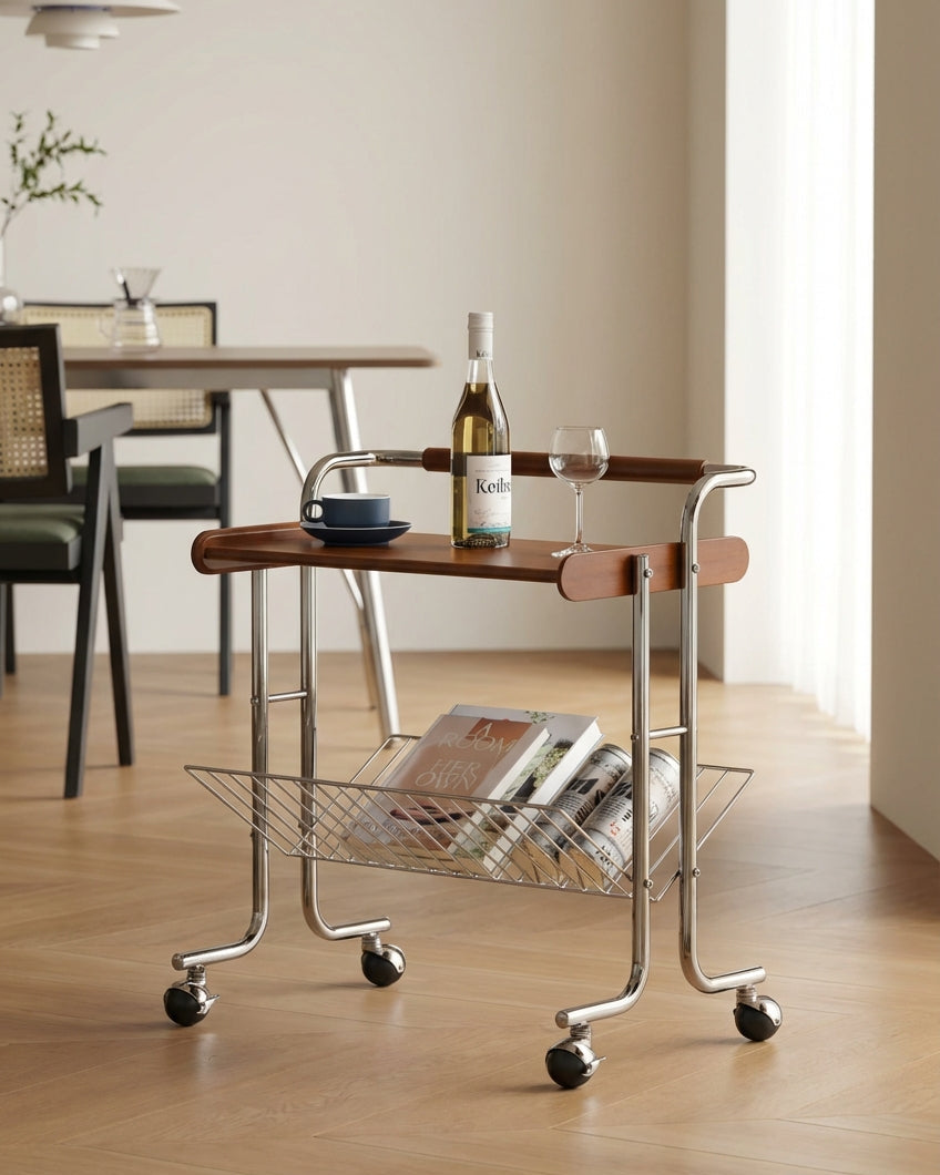 The Milo Vintage Bar Cart with Wheels combines solid wood craftsmanship and a durable stainless steel frame for lasting use. Its 360° swivel wheels offer easy mobility, while the open two-tier design provides practical storage. Ideal for serving, organizing, or as a stylish side table, this cart enhances both function and style in your home.