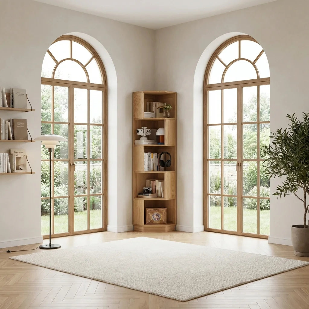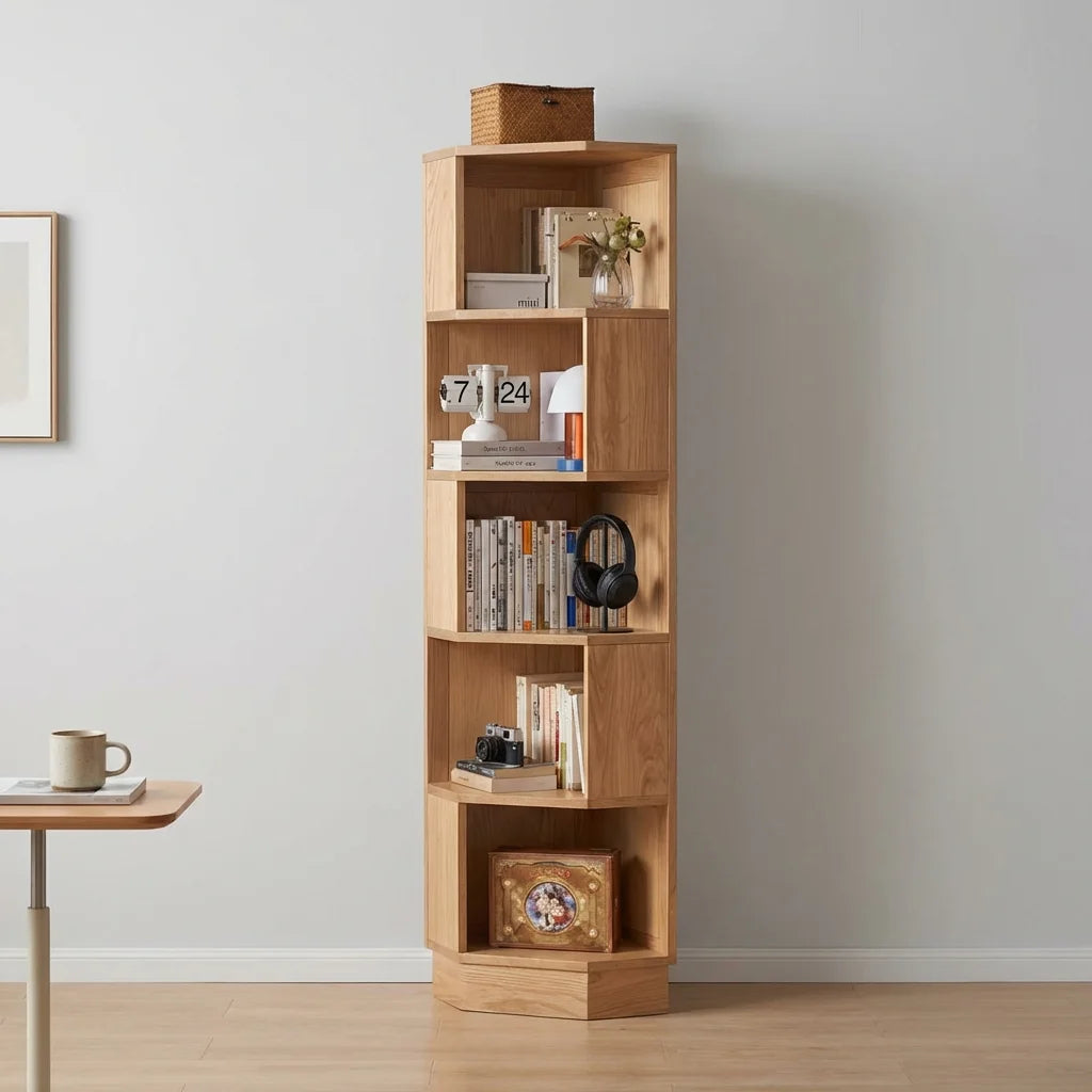 The Stanley Corner Bookshelf is a high-quality corner unit made from durable North American oak. Its 90° design fits flush in corners to save space. Adjustable shelves allow for flexible storage, and the top provides extra space. Suitable for any room, it combines practicality with elegant wood grain.