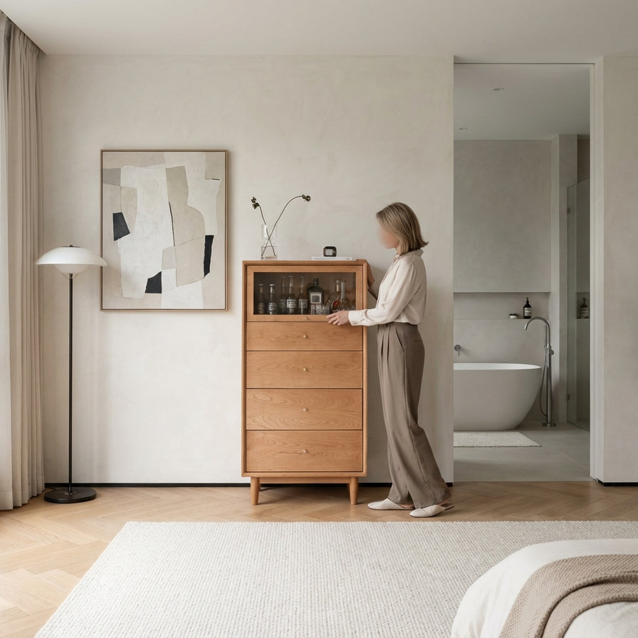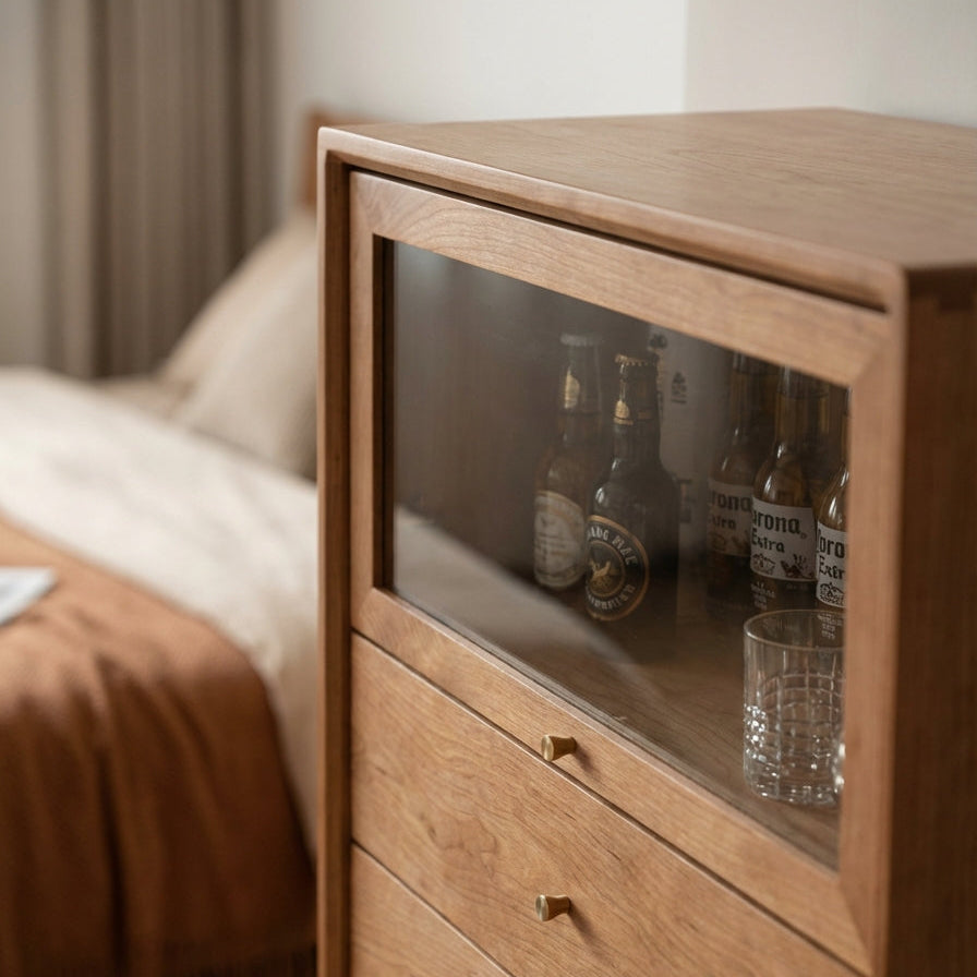 Introducing the Grimm Chest Drawer - the perfect blend of style, quality, and functionality. Crafted from SUP grade cherry wood, this Scandinavian-inspired masterpiece will add a touch of elegance to any room.