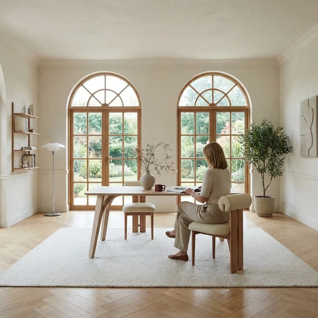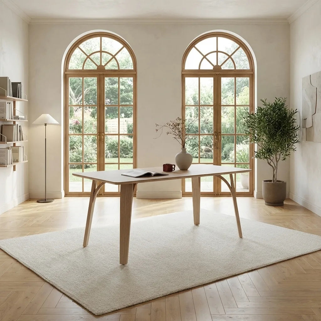 The Rino Minimalist Work Desk combines solid wood craftsmanship with a sleek design. Its durable construction and rounded edges ensure safety and longevity, while the spacious area underneath provides comfort for extended use. Ideal for both work and dining, it brings a refined, functional touch to any room.