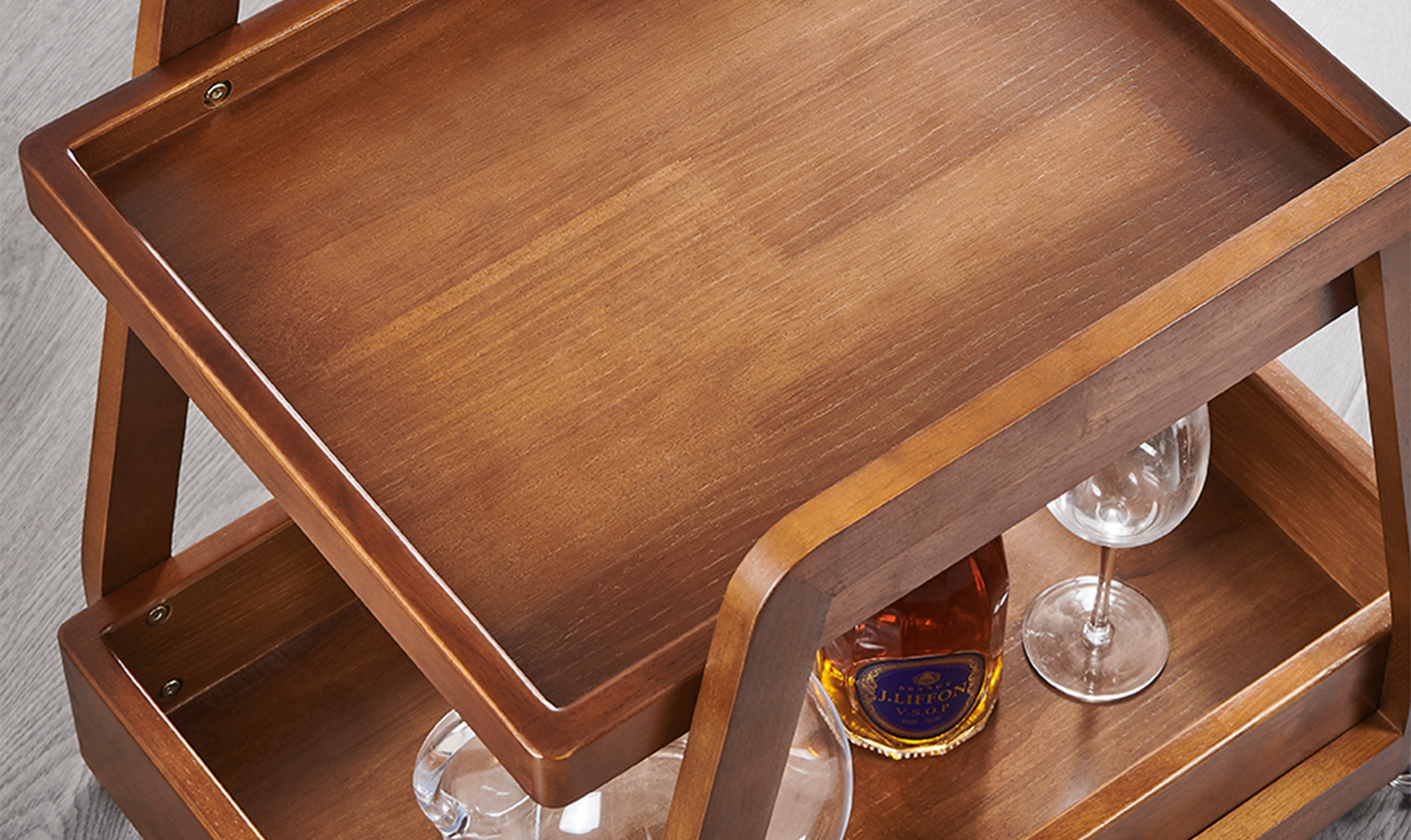 The construction of this bar cart is high-quality. The solid rubberwood is sturdy, and the walnut color is rich. The wheels with locks are a great feature. Highly recommend!