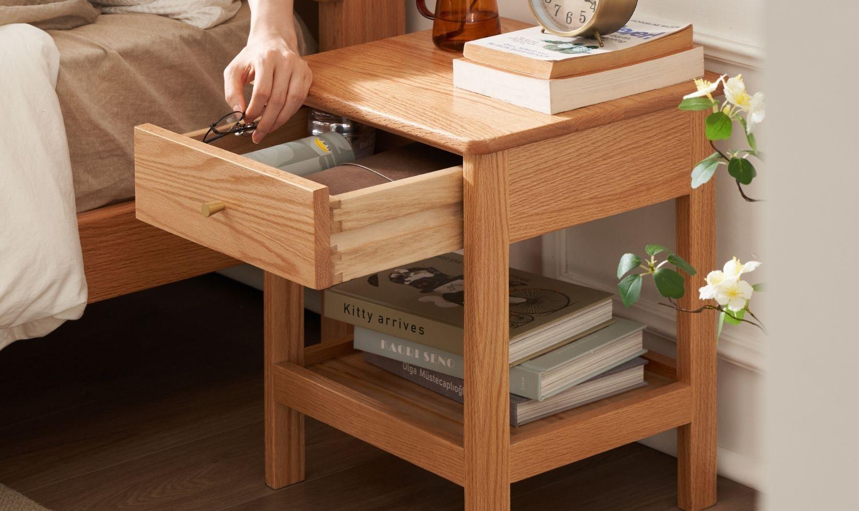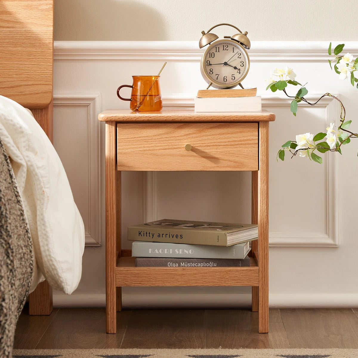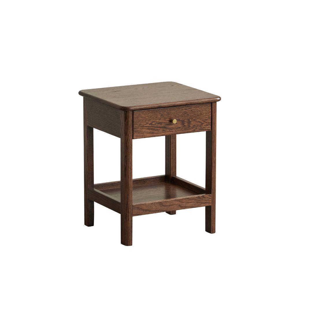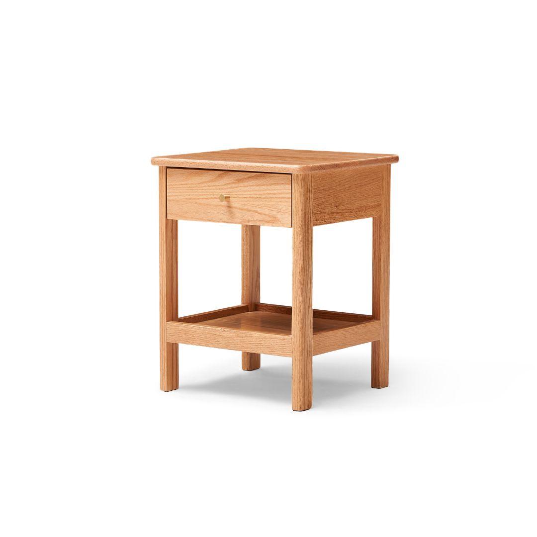 Elevate your bedroom with the Gamo Solid Oak 1-Drawer Nightstand Crafted entirely from solid oak, this Nordic-style nightstand features a spacious top surface, a smooth sealed drawer for private storage, and an open lower shelf for books or decor. The semi-matte painted surface and rounded edges create a warm, refined look while ensuring safety. Durable solid-wood legs and a sturdy frame provide reliable support. Ideal for minimalist, Scandinavian, or modern homes.