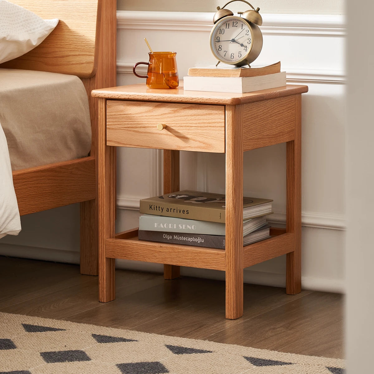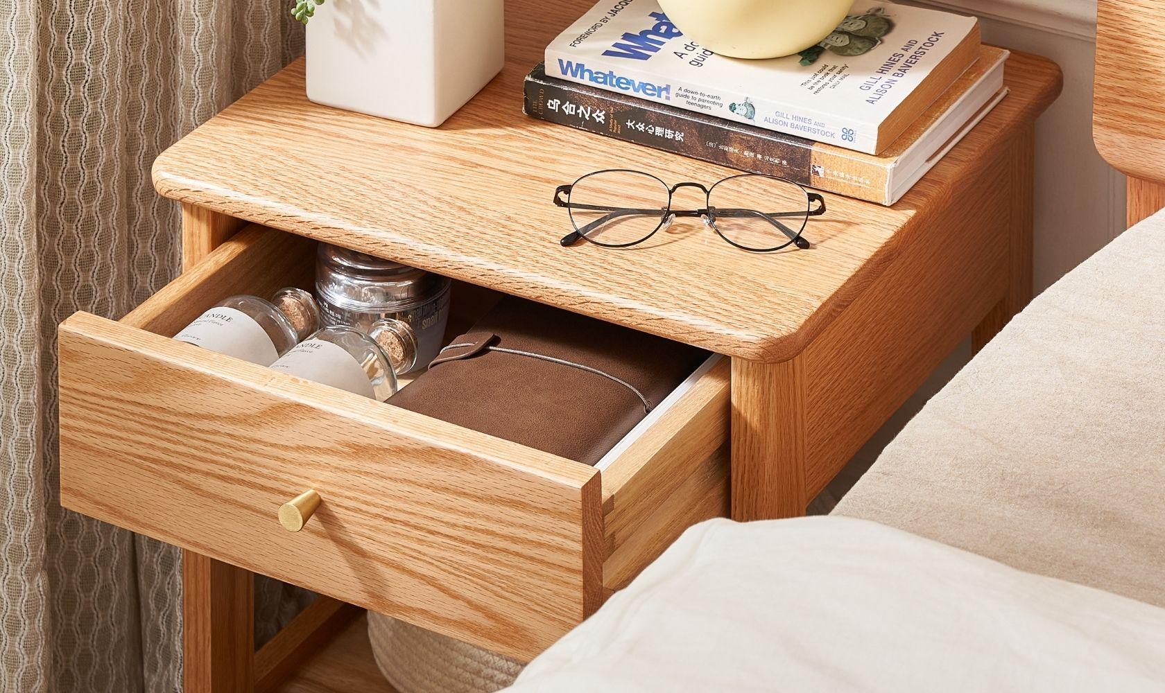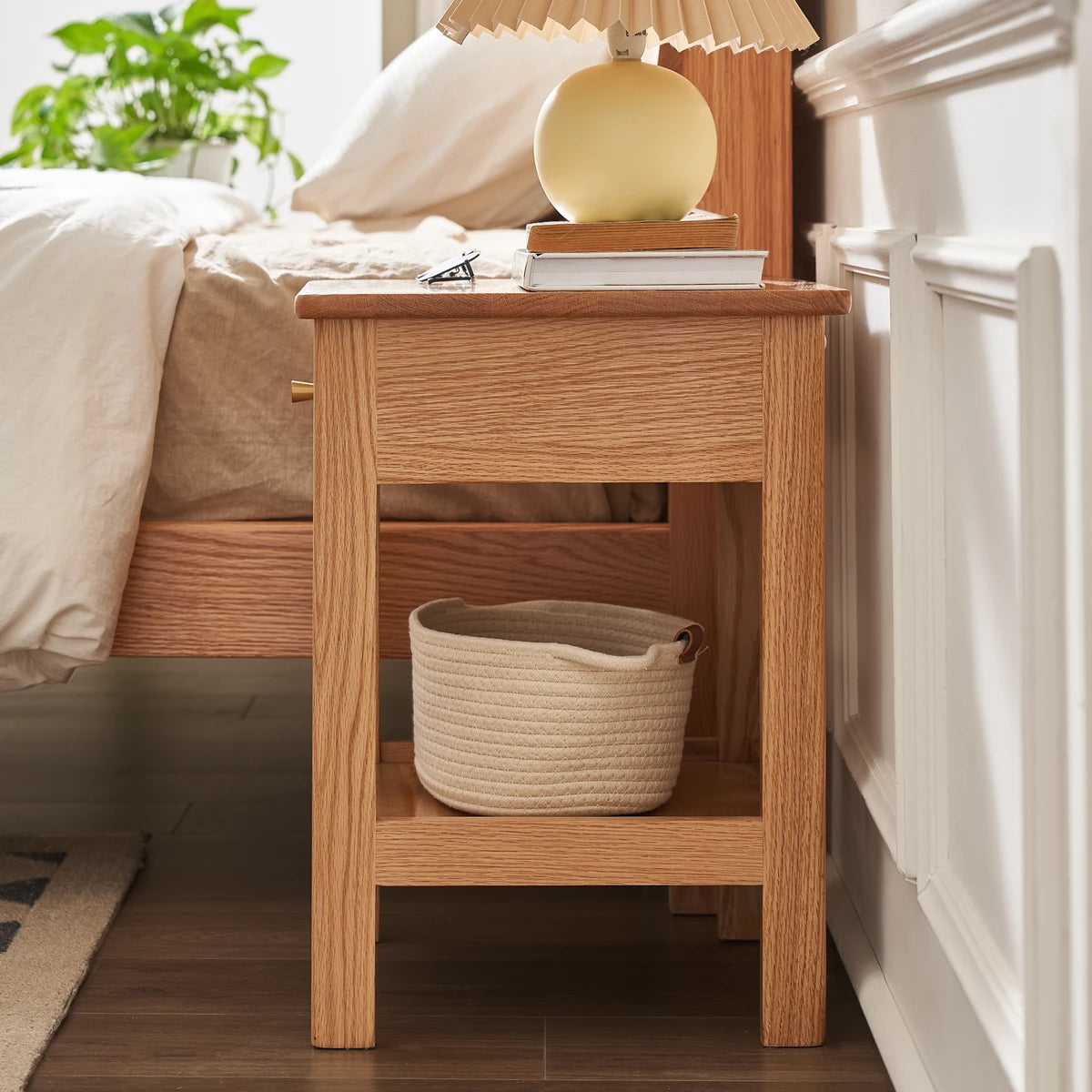 Elevate your bedroom with the Gamo Solid Oak 1-Drawer Nightstand Crafted entirely from solid oak, this Nordic-style nightstand features a spacious top surface, a smooth sealed drawer for private storage, and an open lower shelf for books or decor. The semi-matte painted surface and rounded edges create a warm, refined look while ensuring safety. Durable solid-wood legs and a sturdy frame provide reliable support. Ideal for minimalist, Scandinavian, or modern homes.