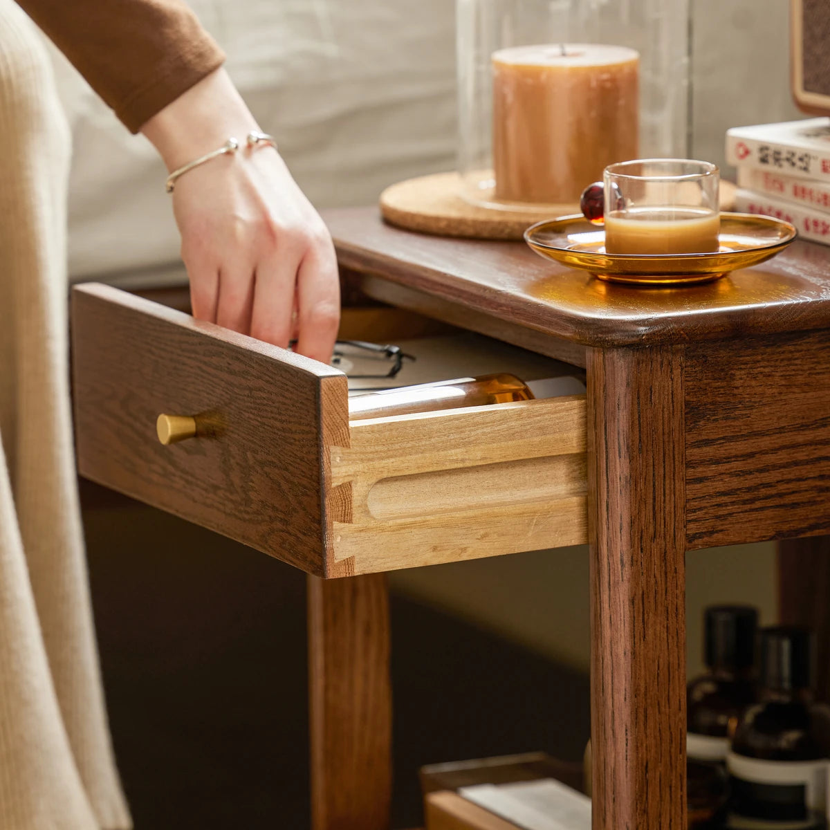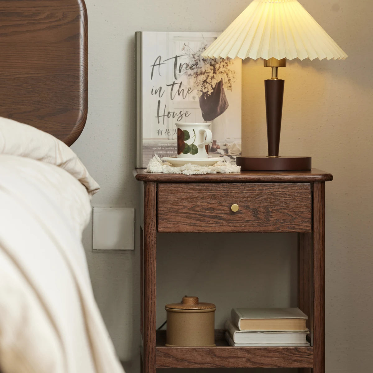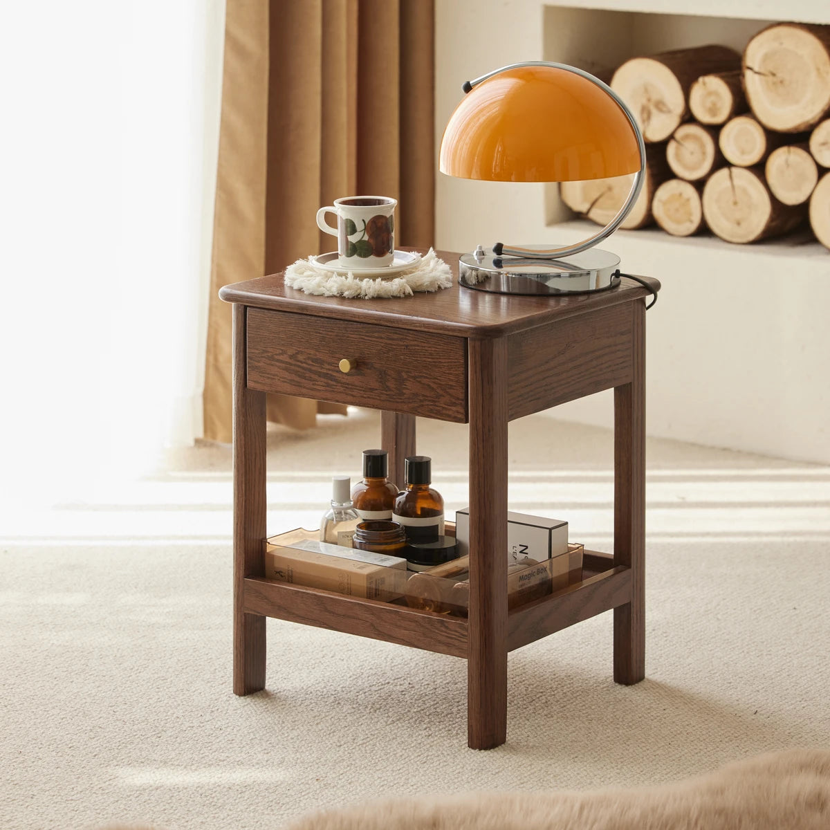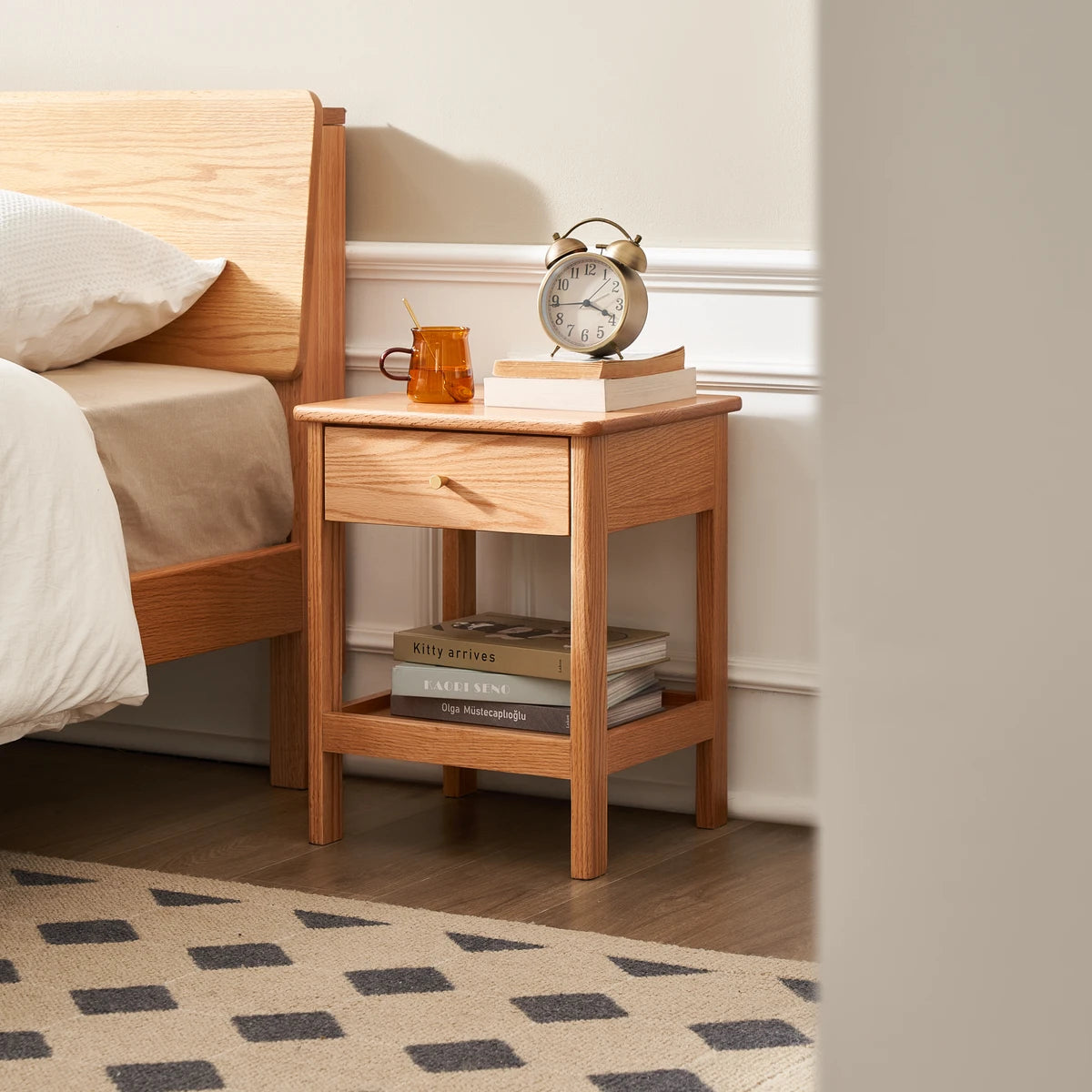 Elevate your bedroom with the Gamo Solid Oak 1-Drawer Nightstand Crafted entirely from solid oak, this Nordic-style nightstand features a spacious top surface, a smooth sealed drawer for private storage, and an open lower shelf for books or decor. The semi-matte painted surface and rounded edges create a warm, refined look while ensuring safety. Durable solid-wood legs and a sturdy frame provide reliable support. Ideal for minimalist, Scandinavian, or modern homes.