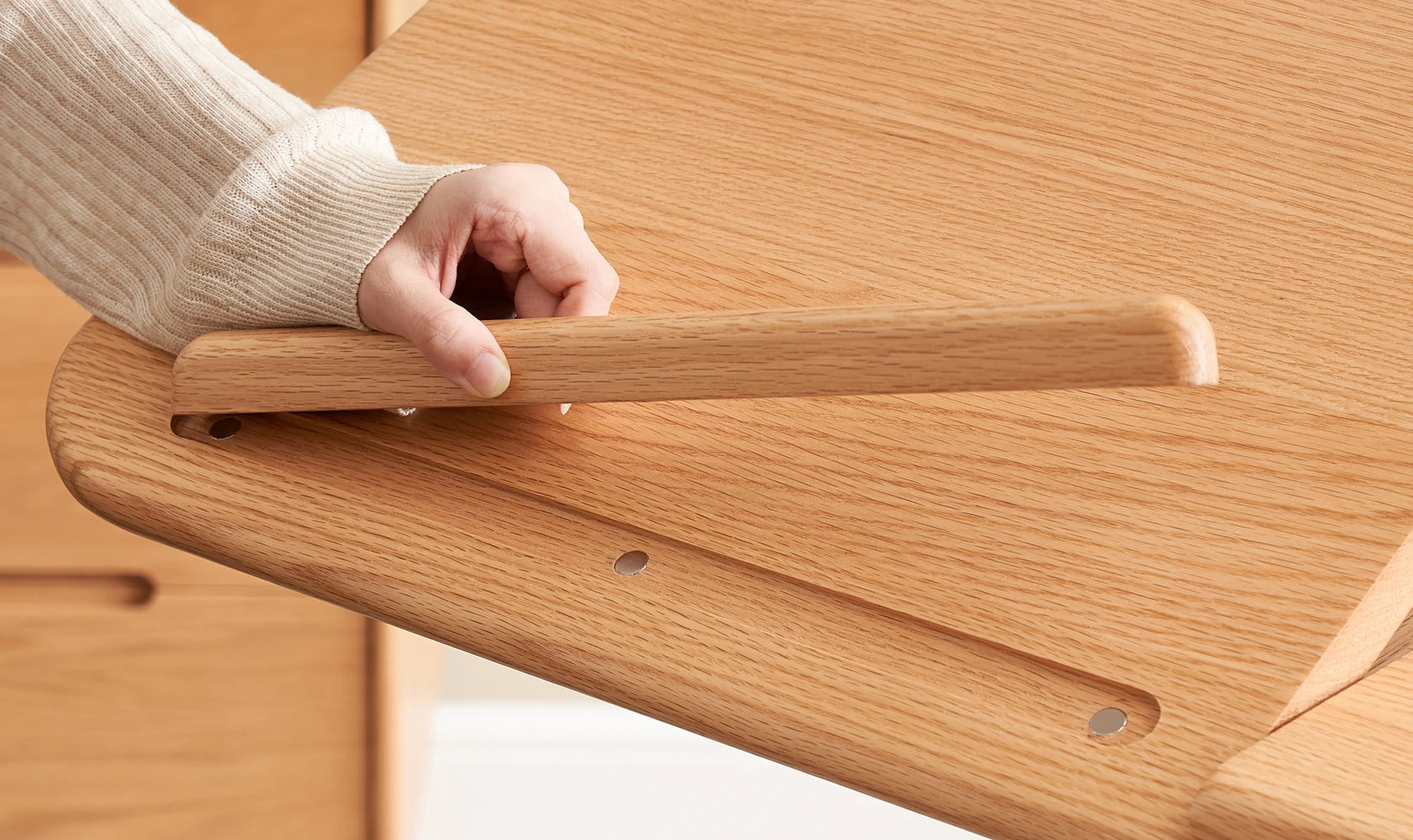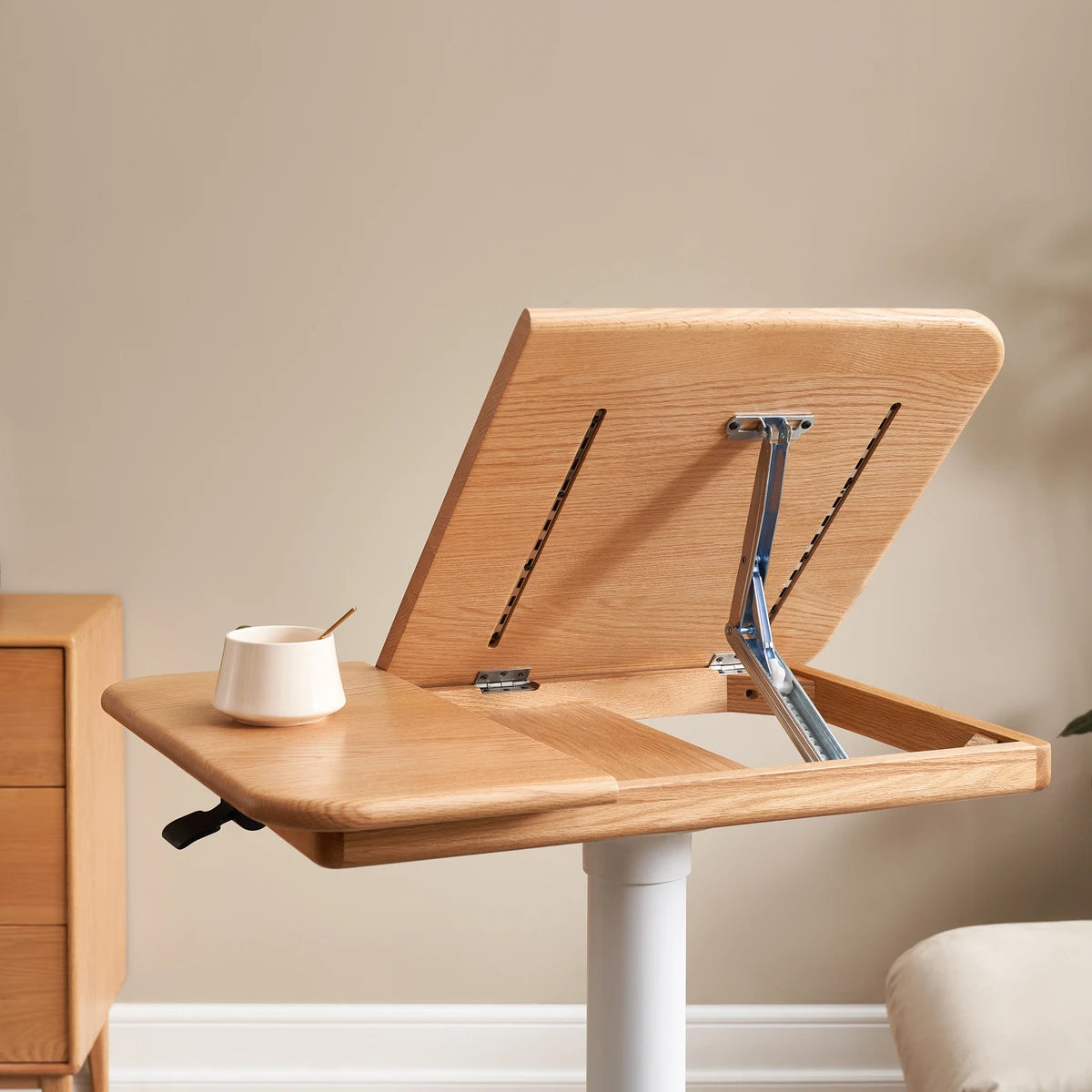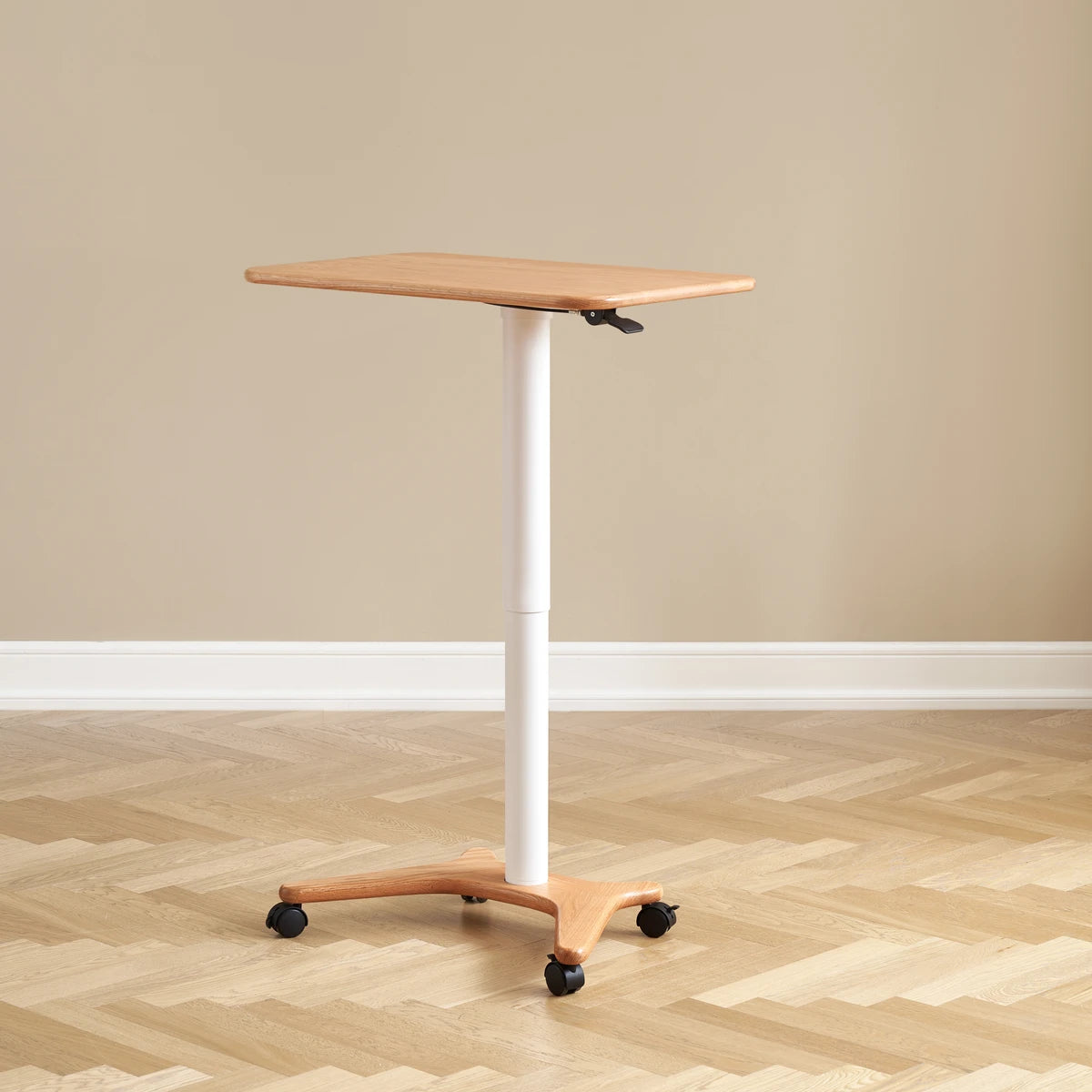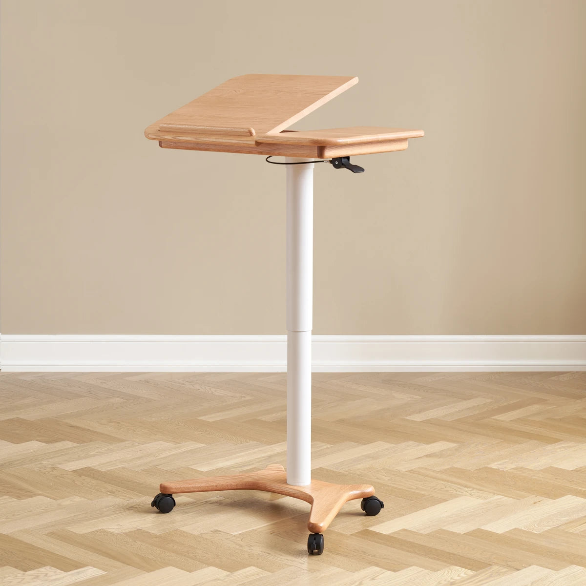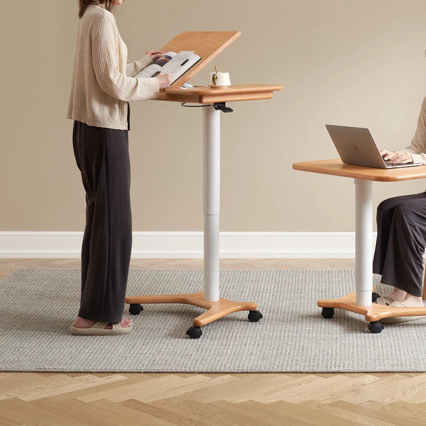 Elevate your workspace with the Sorrel Solid Oak Adjustable Mobile Desk. Crafted from premium North American FAS oak, it combines sturdy construction with flexible functionality. The height-adjustable design (713-1153mm) and tilting top (10 angles) let you work, read, or draw in comfort, while the smooth-rolling wheels make it easy to move between rooms. A removable solid wood stop bar keeps books or devices in place, and the thick 20mm tabletop ensures lasting durability. Perfect for home offices, living rooms, and study spaces.