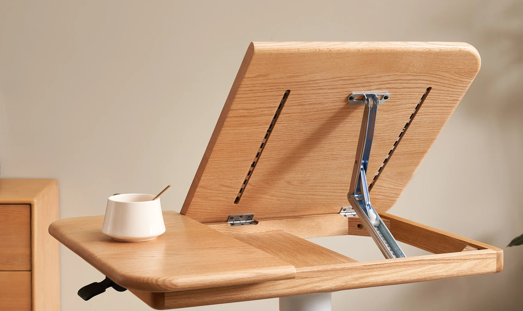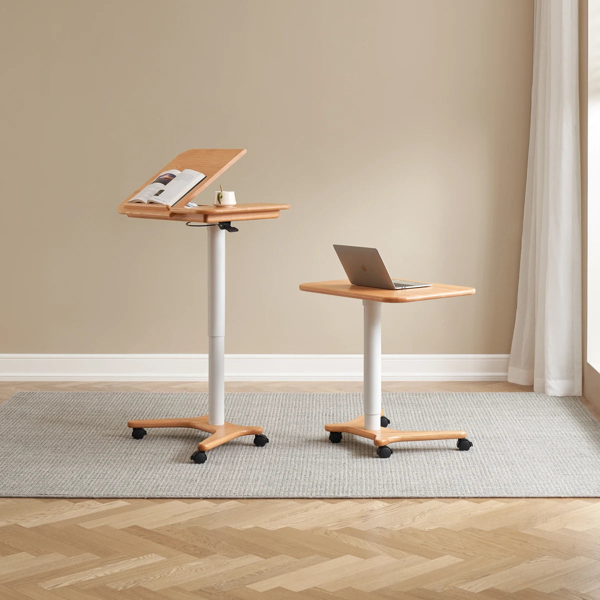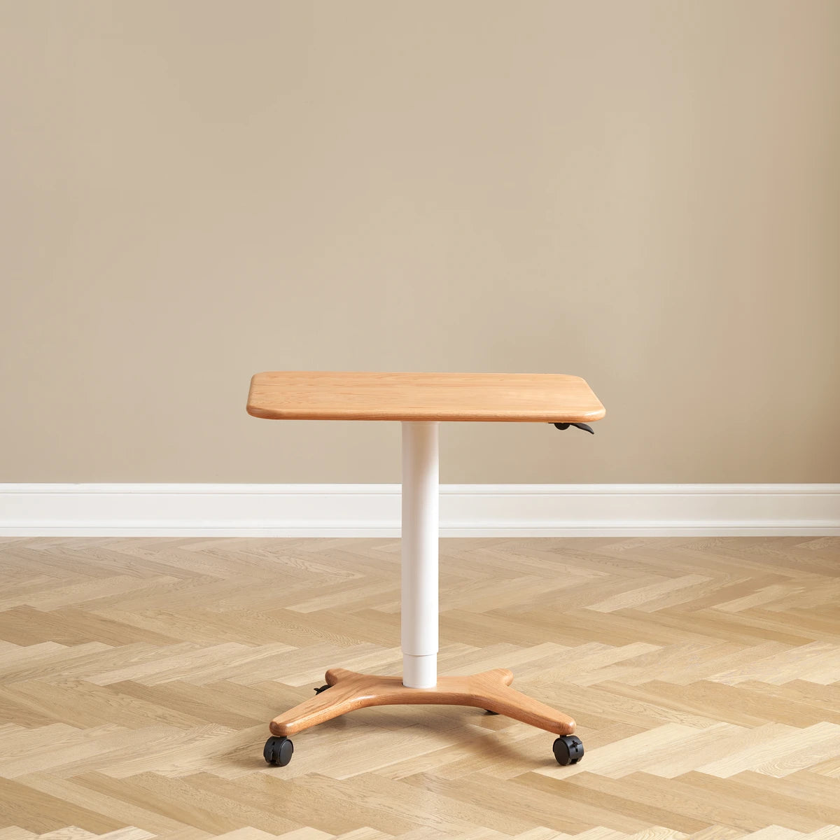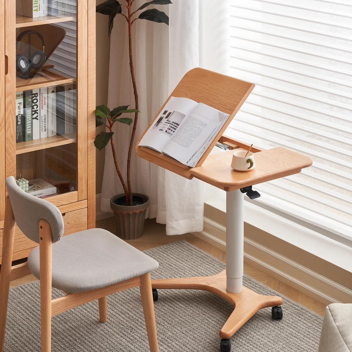 Elevate your workspace with the Sorrel Solid Oak Adjustable Mobile Desk. Crafted from premium North American FAS oak, it combines sturdy construction with flexible functionality. The height-adjustable design (713-1153mm) and tilting top (10 angles) let you work, read, or draw in comfort, while the smooth-rolling wheels make it easy to move between rooms. A removable solid wood stop bar keeps books or devices in place, and the thick 20mm tabletop ensures lasting durability. Perfect for home offices, living rooms, and study spaces.