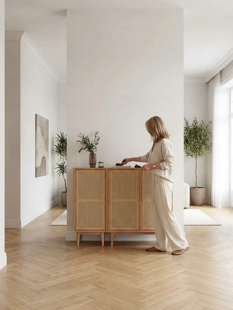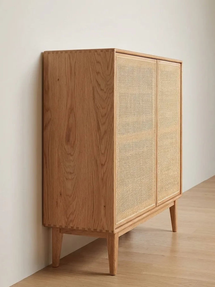 The Versa Rattan-Weave Door Shoe Storage Cabinet combines solid oak durability with woven rattan doors for natural ventilation. It offers adjustable shelves to store up to 20 pairs of shoes and features a push-to-open design for easy access. An anti-tip device ensures safety, making it a practical and stylish addition to your entryway.