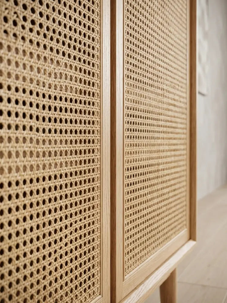 The cabinet doors are made from woven rattan, which ensures proper ventilation and prevents odors. The design is both stylish and easy to clean.