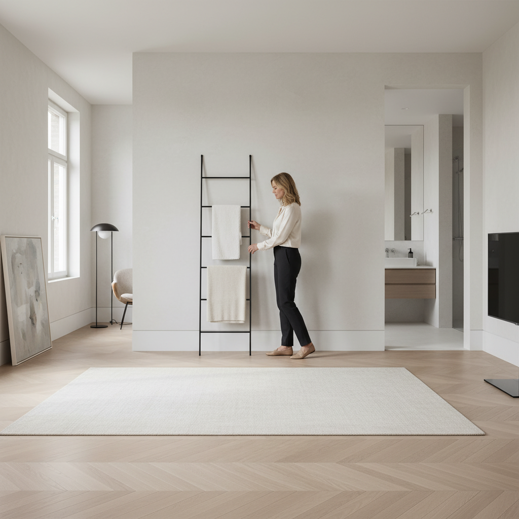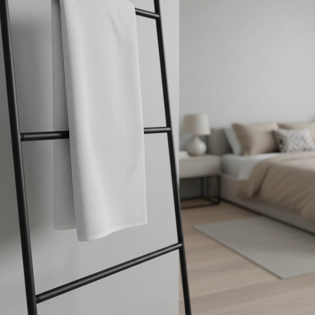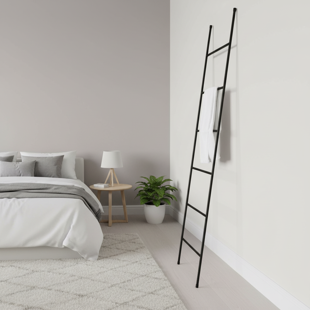 This blanket ladder leans cleanly and is a welcome and stylish storage addition to any room. Keep throwing blankets, towels, or clothing close while giving your space a fashionable furniture accessory. Clean, symmetrical lines on this sleek black steel frame are easy on the eyes while the six rungs provide instant storage.