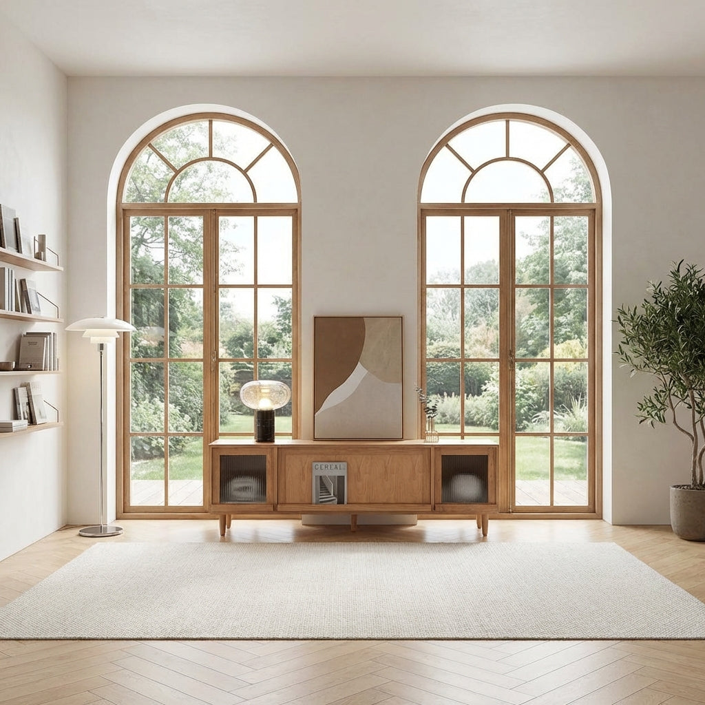 Features unique upward-opening glass doors for easy access. The design combines aesthetics and practicality, allowing you to display items while keeping them dust-free. The groove on the door acts as both a handle and a storage spot for books or photos.